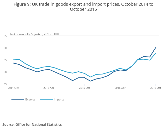 Between the 3 months to July 2016 and the 3 months to October 2016, the UK’s trade in goods deficit with the EU widened by £1.9 billion to £24.5 billion and the UK’s trade in goods deficit with countries outside the EU widened by £4.3 billion to £12.5 billion, attributed to an increase in exports (2.1%) and an increase in imports (10.9%).