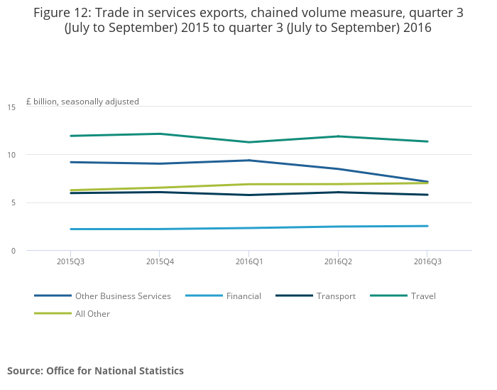 Figure 12: Trade in services exports, chained volume measure, quarter 3 (July to September) 2015 to quarter 3 (July to September) 2016