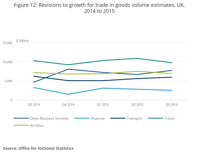 Revisions to quarter 3 (July to September) 2015 mainly reflect updated estimates from our International Passenger Survey. Exports saw minimal change for all monthly periods and imports were revised up in September 2015 by £0.2 billion.