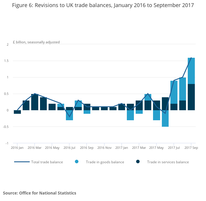 Data in this release have been revised from January 2016 to September 2017 for both trade in goods and services; most of the revisions to the total trade balance are relatively small and mainly upward, although July to September 2017 saw larger revisions.