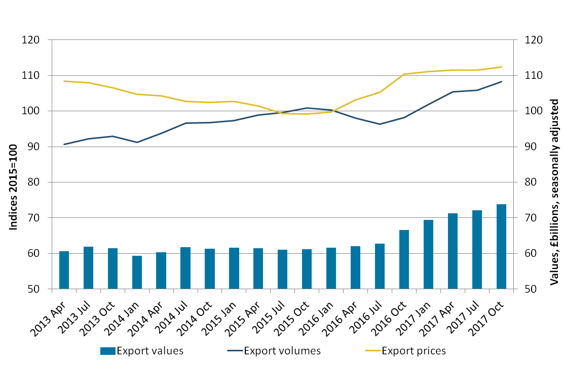 Total goods export volumes increased 3.2% in the three months to October 2017, which was the fourth consecutive and largest increase since January 2017. Import volumes increased 0.5% over the same period. Export and import prices increased 1.5% and 1.3% respectively, following a decrease in both prices in the three months to July 2017. The £3.2 billion (3.8%) increase in the value of total goods exports was therefore due primarily to volume movements, while the increase in total goods imports value of £1.6 billion (1.3%) was due mainly to price movements.
