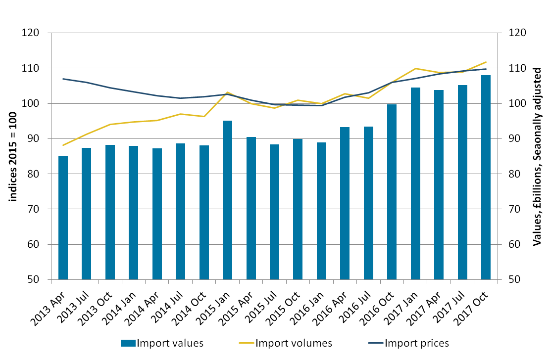As a result of import volumes increasing by a larger proportion than export volumes, while prices remained relatively flat over the period, the goods excluding oil and erratics deficit widened by £1.1 billion to £34.1 billion. This coincides with a decrease in the value of sterling in the three months to October 2017.