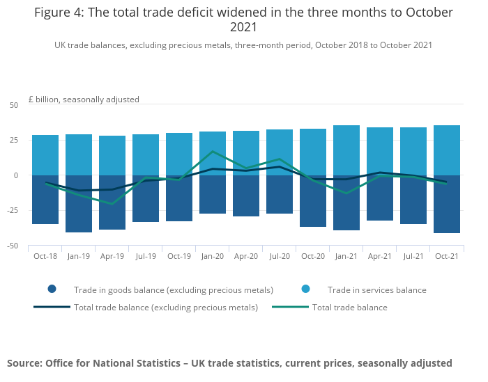 - The total trade in goods and services deficit, excluding precious metals, widened by £4.5 billion to £5.2 billion in the three months to October 2021, driven by a deteriorating trade in goods balance, excluding precious metals.