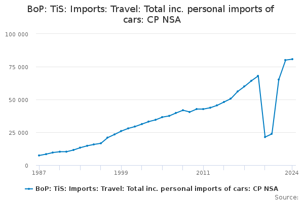 Download this time seriesBoP: TiS: Imports: Travel: Total inc. personal imports of cars: CP NSA