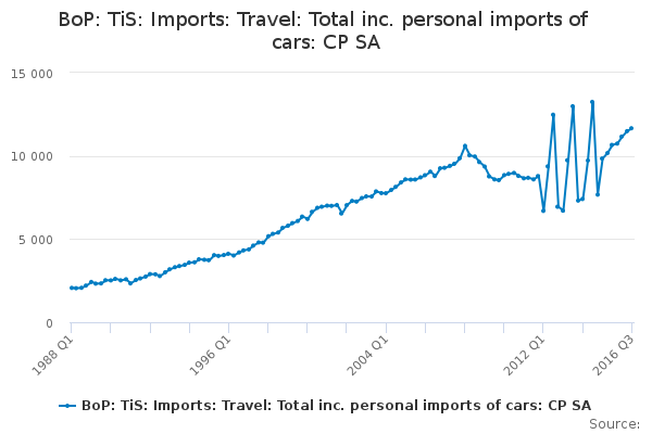 Download this time seriesBoP: TiS: Imports: Travel: Total inc. personal imports of cars: CP SA
