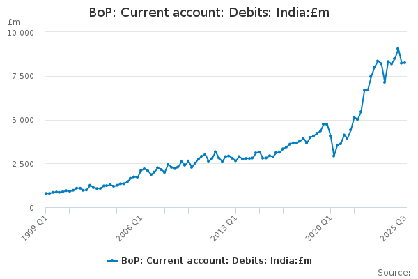 Download this time seriesBoP: Current account: Debits: India:£m