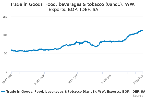 Download this time seriesTrade in Goods: Food, beverages & tobacco (0and1): WW: Exports: BOP: IDEF: SA