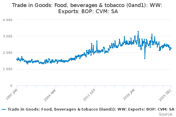 Download this time seriesTrade in Goods: Food, beverages & tobacco (0and1): WW: Exports: BOP: CVM: SA