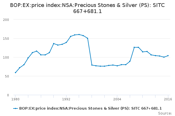 Download this time seriesBOP:EX:price index:NSA:Precious Stones & Silver (PS): SITC 667+681.1
