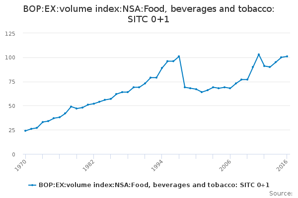 Download this time seriesBOP:EX:volume index:NSA:Food, beverages and tobacco: SITC 0+1
