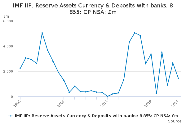 Download this time seriesIMF IIP: Reserve Assets Currency & Deposits with banks: 8 855: CP NSA: £m