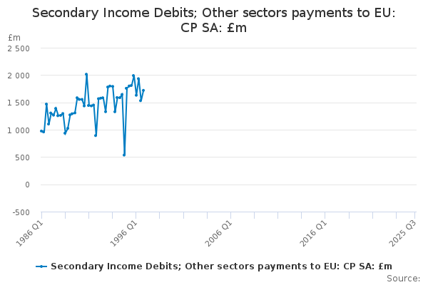 Download this time seriesSecondary Income Debits; Other sectors payments to EU: CP SA: £m