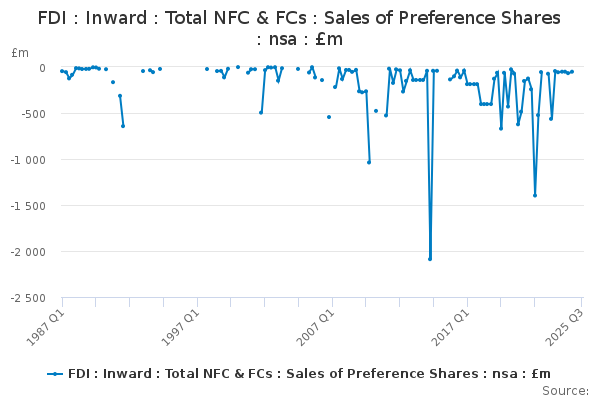 Download this time seriesFDI : Inward : Total NFC & FCs : Sales of Preference Shares : nsa : £m