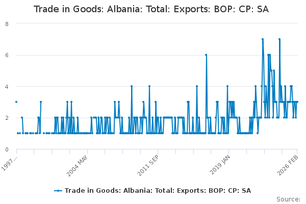 Download this time seriesTrade in Goods: Albania: Total: Exports: BOP: CP: SA