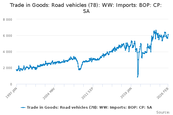 Download this time seriesTrade in Goods: Road vehicles (78): WW: Imports: BOP: CP: SA