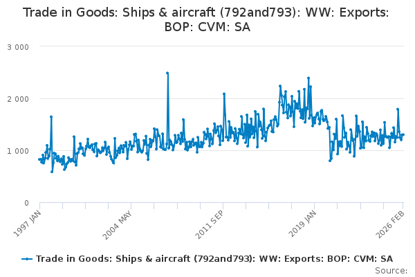 Download this time seriesTrade in Goods: Ships & aircraft (792and793): WW: Exports: BOP: CVM: SA