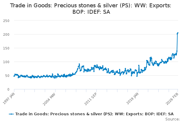 Download this time seriesTrade in Goods: Precious stones & silver (PS): WW: Exports: BOP: IDEF: SA