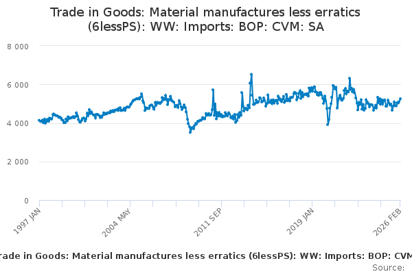 Download this time seriesTrade in Goods: Material manufactures less erratics (6lessPS): WW: Imports: BOP: CVM: SA