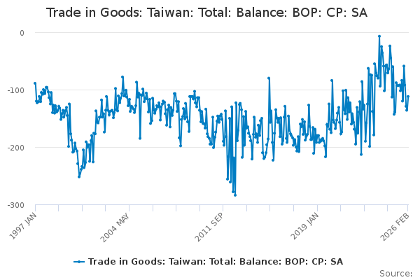 Download this time seriesTrade in Goods: Taiwan: Total: Balance: BOP: CP: SA