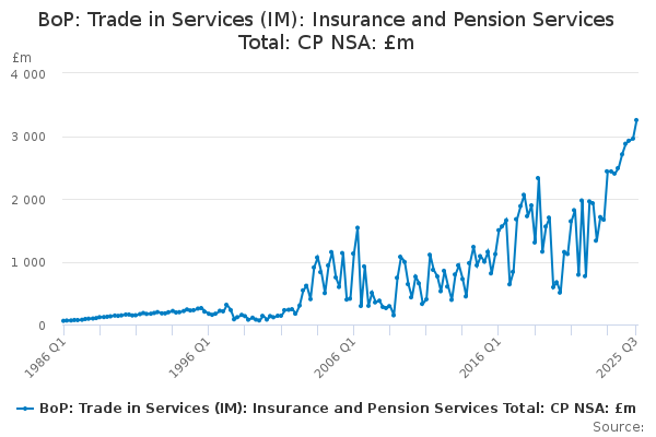 Download this time seriesBoP: Trade in Services (IM): Insurance and Pension Services Total: CP NSA: £m