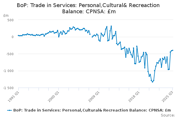 Download this time seriesBoP: Trade in Services: Personal,Cultural& Recreaction Balance: CPNSA: £m
