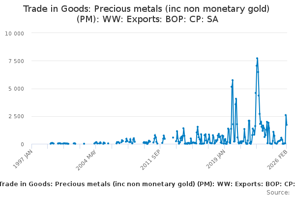 Download this time seriesTrade in Goods: Precious metals (inc non monetary gold) (PM): WW: Exports: BOP: CP: SA