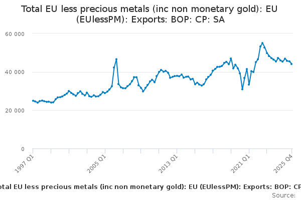 Download this time seriesTotal EU less precious metals (inc non monetary gold): EU (EUlessPM): Exports: BOP: CP: SA