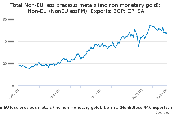 Download this time seriesTotal Non-EU less precious metals (inc non monetary gold): Non-EU (NonEUlessPM): Exports: BOP: CP: SA