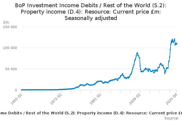 Download this time seriesBoP Investment Income Debits / Rest of the World (S.2): Property income (D.4): Resource: Current price £m: Seasonally adjusted