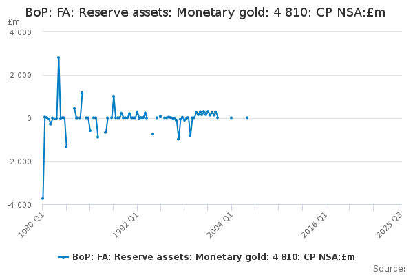 Download this time seriesBoP: FA: Reserve assets: Monetary gold: 4 810: CP NSA:£m