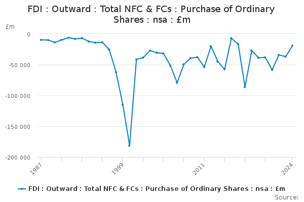 Download this time seriesFDI : Outward : Total NFC & FCs : Purchase of Ordinary Shares : nsa : £m