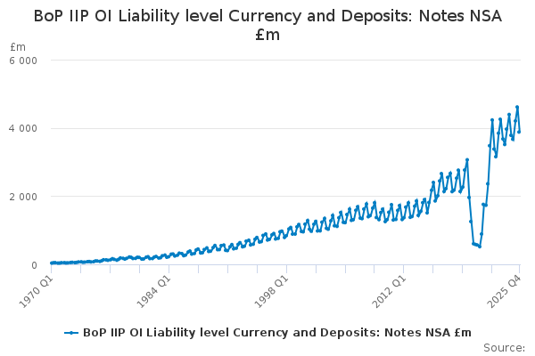 Download this time seriesBoP IIP OI Liability level Currency and Deposits: Notes NSA £m