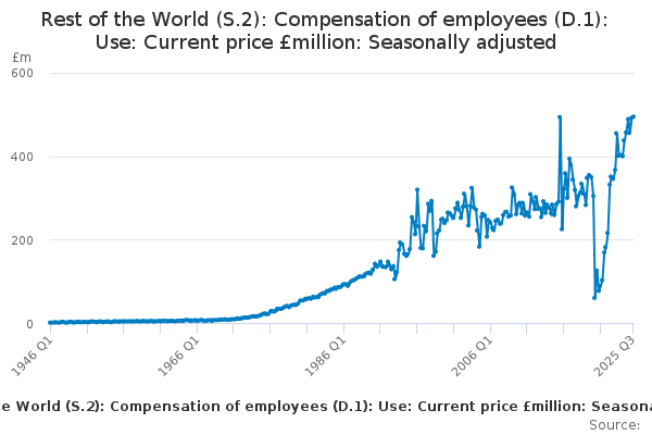 Download this time seriesRest of the World (S.2): Compensation of employees (D.1): Use: Current price £million: Seasonally adjusted