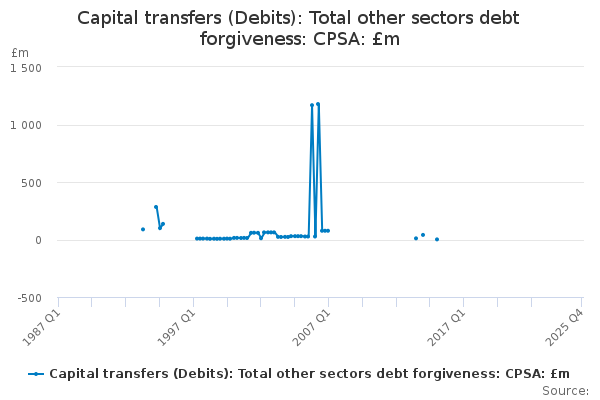 Download this time seriesCapital transfers (Debits): Total other sectors debt forgiveness: CPSA: £m