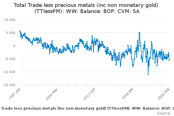 Download this time seriesTotal Trade less precious metals (inc non monetary gold) (TTlessPM): WW: Balance: BOP: CVM: SA