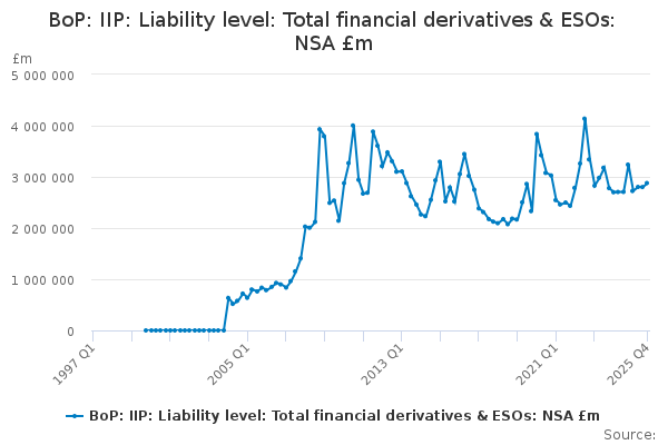 Download this time seriesBoP: IIP: Liability level: Total financial derivatives & ESOs: NSA £m