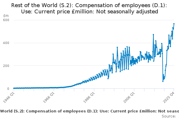 Download this time seriesRest of the World (S.2): Compensation of employees (D.1): Use: Current price £million: Not seasonally adjusted