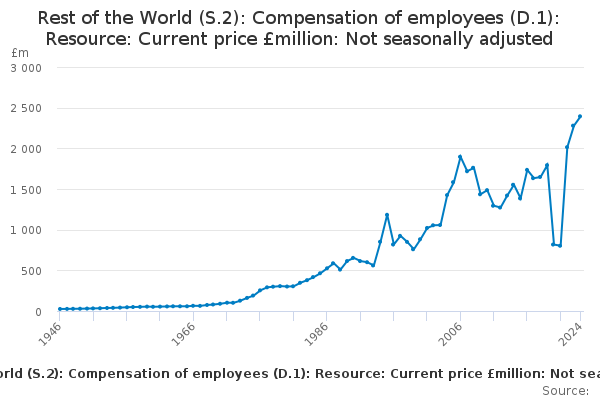 Download this time seriesRest of the World (S.2): Compensation of employees (D.1): Resource: Current price £million: Not seasonally adjusted