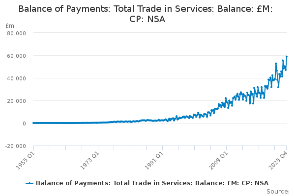 Download this time seriesBalance of Payments: Total Trade in Services: Balance: £M: CP: NSA