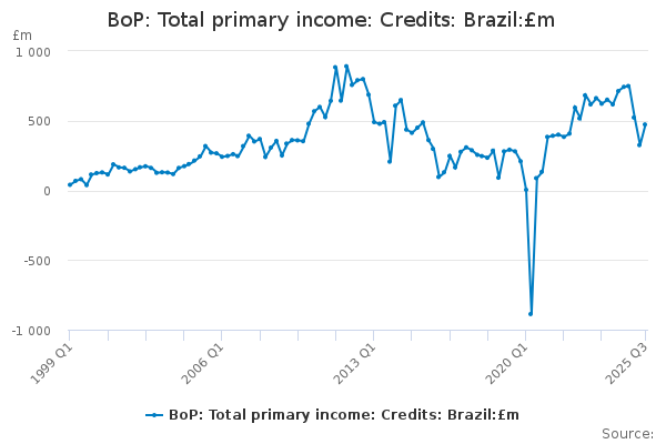 Download this time seriesBoP: Total primary income: Credits: Brazil:£m