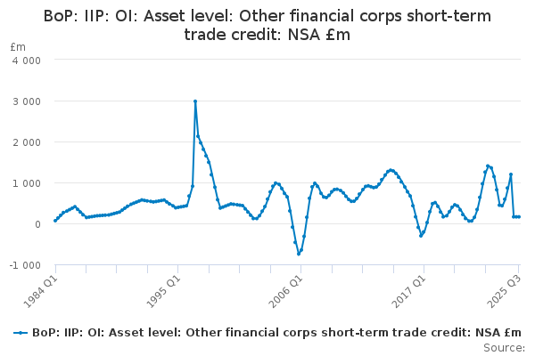 Download this time seriesBoP: IIP: OI: Asset level: Other financial corps short-term trade credit: NSA £m