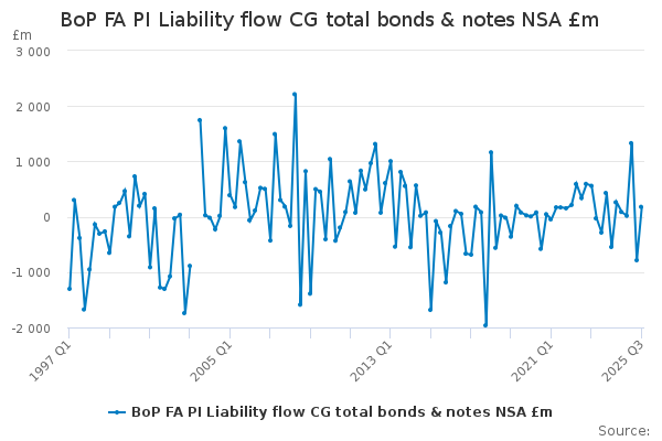Download this time seriesBoP FA PI Liability flow CG total bonds & notes NSA £m