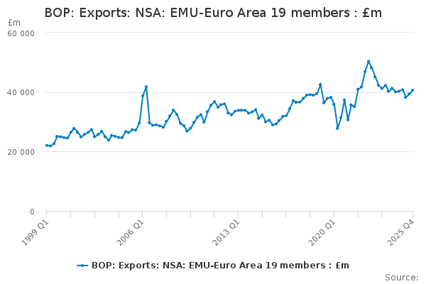 Download this time seriesBOP: Exports: NSA: EMU-Euro Area 19 members : £m