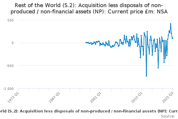 Download this time seriesRest of the World (S.2): Acquisition less disposals of non-produced / non-financial assets (NP): Current price £m: NSA
