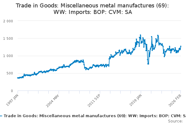 Download this time seriesTrade in Goods: Miscellaneous metal manufactures (69): WW: Imports: BOP: CVM: SA