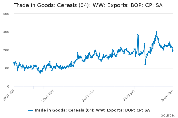 Download this time seriesTrade in Goods: Cereals (04): WW: Exports: BOP: CP: SA