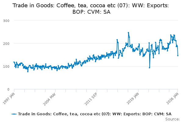 Download this time seriesTrade in Goods: Coffee, tea, cocoa etc (07): WW: Exports: BOP: CVM: SA