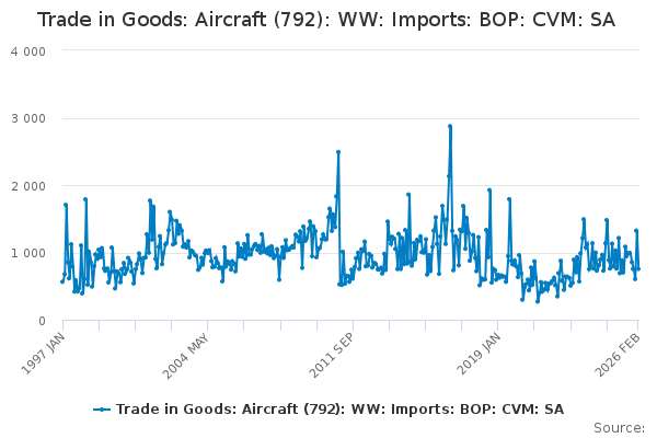 Download this time seriesTrade in Goods: Aircraft (792): WW: Imports: BOP: CVM: SA