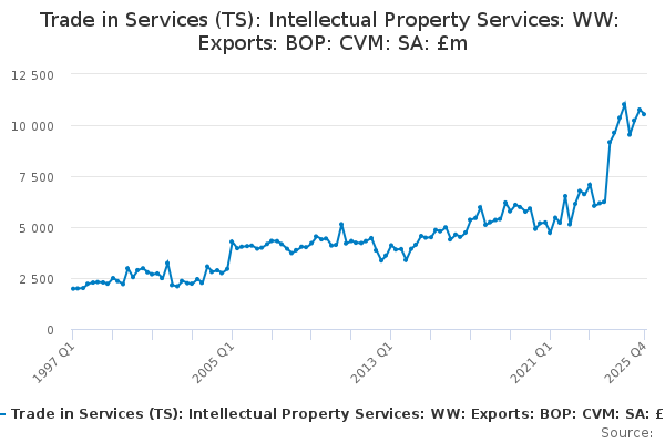 Download this time seriesTrade in Services (TS): Intellectual Property Services: WW: Exports: BOP: CVM: SA: £m
