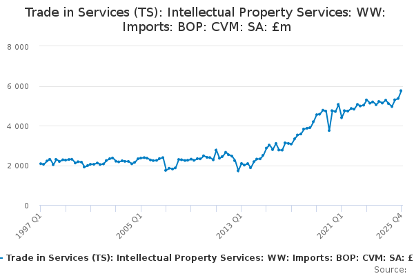 Download this time seriesTrade in Services (TS): Intellectual Property Services: WW: Imports: BOP: CVM: SA: £m